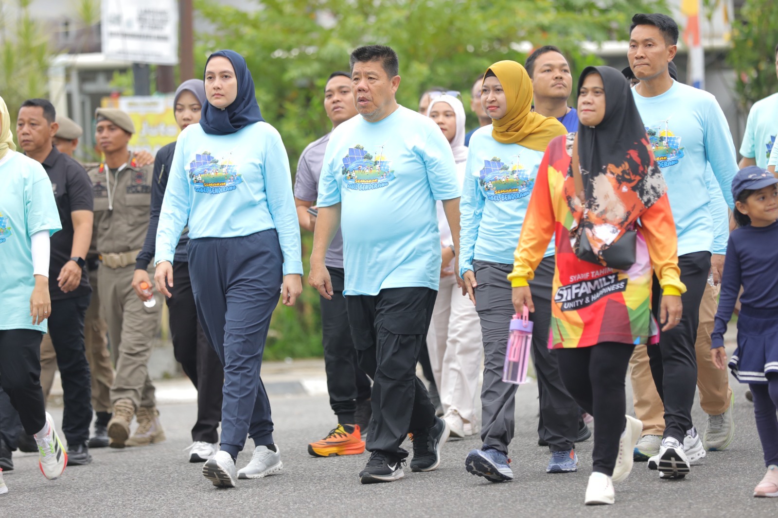 Pelepasan peserta jalan sehat di Alun-Alun Taman Merdeka, Kota Pangkalpinang, Sabtu (25/10/2025), dan ditandai dengan pengibaran bendera start itu, turut didampingi Ketua TP PKK Babel, Noni Hidayat, Wali Kota Pangkalpinang, Prof Udinm Wakil Wali Kota, Dessy, General Manager PLN Babel, Ira Savitri, dan Forkopimda Babel.