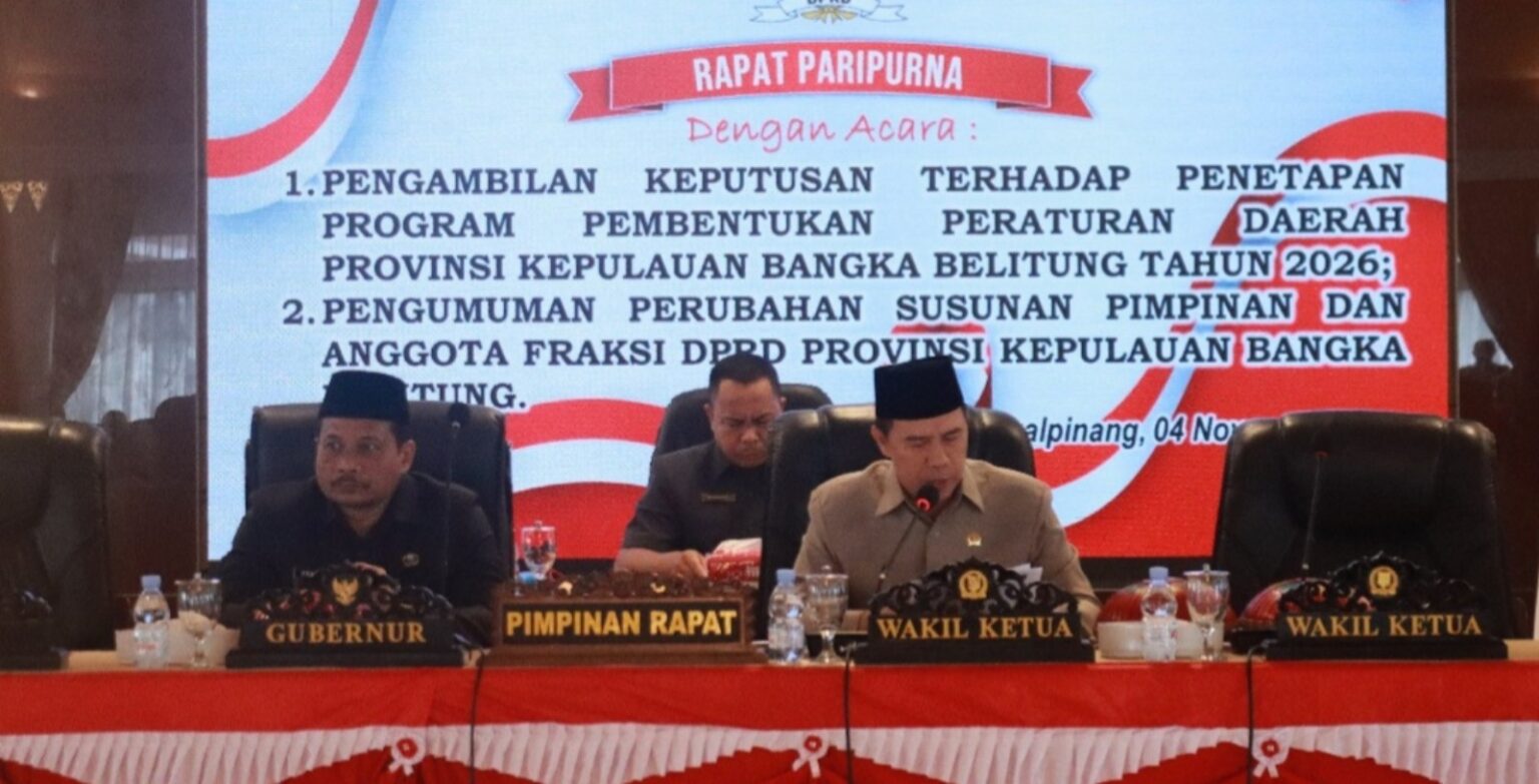 Pangkalpinang — Dewan Perwakilan Rakyat Daerah (DPRD) Provinsi Kepulauan Bangka Belitung (Babel) resmi menetapkan Program Pembentukan Peraturan Daerah (Propemperda) Tahun 2026. Penetapan dilakukan melalui Rapat Paripurna di Gedung Mahligai Rumah Dinas Gubernur, Senin (17/11/2025). Selain itu, DPRD juga menerima dua Rancangan Peraturan Daerah (Raperda) Inisiatif yang akan dibahas pada masa sidang berikutnya.