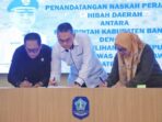 Sungailiat – Pj. Bupati Bangka Isnaini bersama Ketua KPU Bangka Sinarto dan Ketua Bawaslu Kabupaten Bangka Sugesti melaksanakan Penandatanganan Naskah Perjanjian Hibah